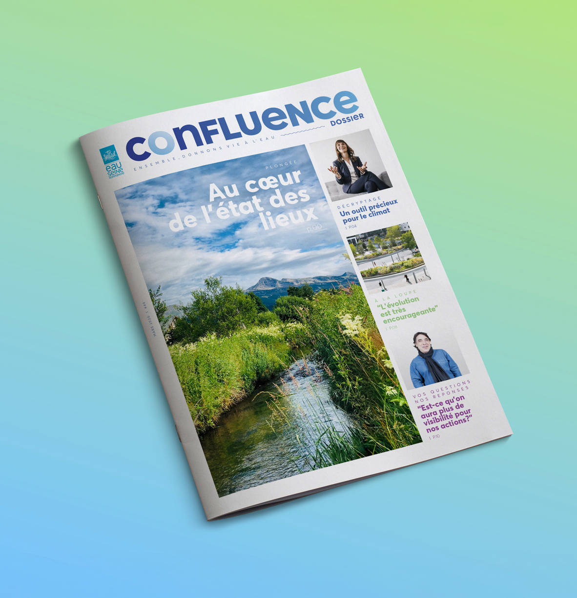 Une nouvelle approche graphique et éditoriale de Confluence, revue thématique de l’Agence Eau Seine-Normandie chargée de la lutte contre la pollution et de la protection des milieux aquatiques. Une mise en page fraîche, incarnée, rythmée par des contenus variés.