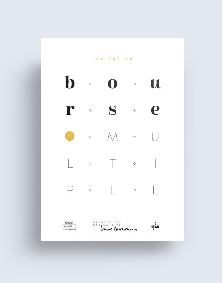 La bourse du multiple vient en aide aux jeunes diplômé·e·s de la Hear afin de réaliser un projet de création personnelle : une œuvre multiple (produite en plusieurs exemplaires). Portée par l’association des amis de Louise Desrosiers depuis plusieurs années, une identité raffinée et minimale a été déployée pour communiquer autour de cet événement, ses lauréat.es et leurs projets, ses jurys et les différents acteurs qui participent à cette aventure. Retrouvez tout l’historique de la bourse sur son compte instagram.