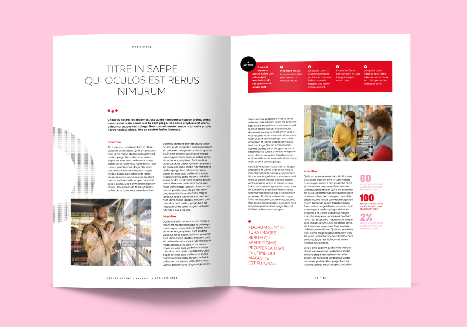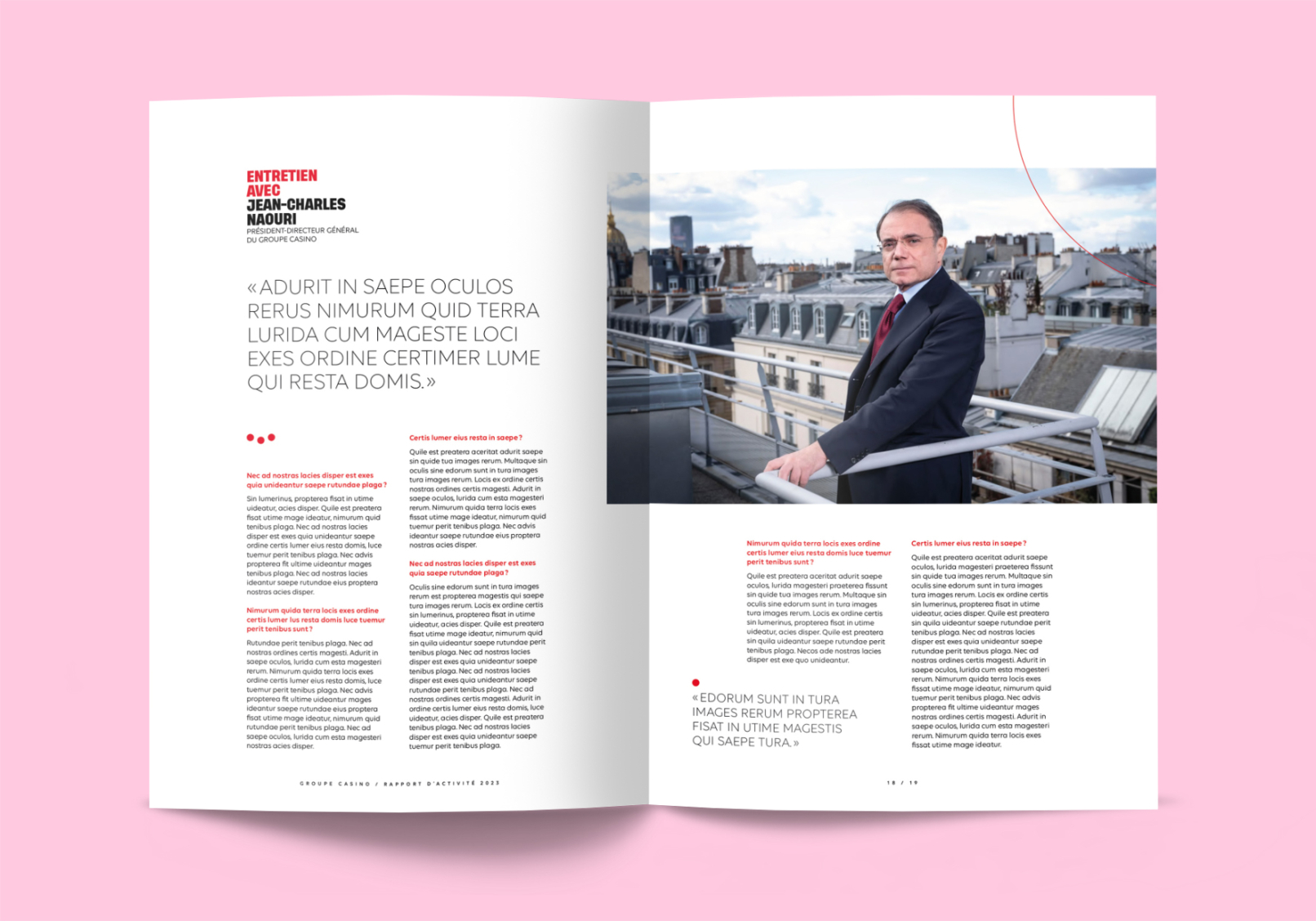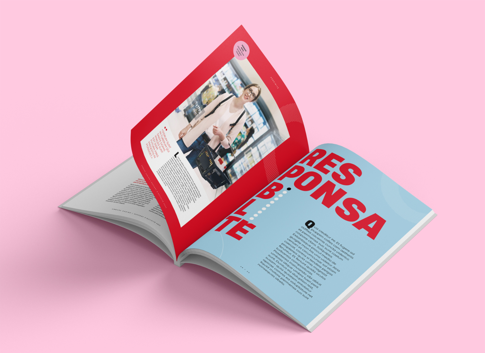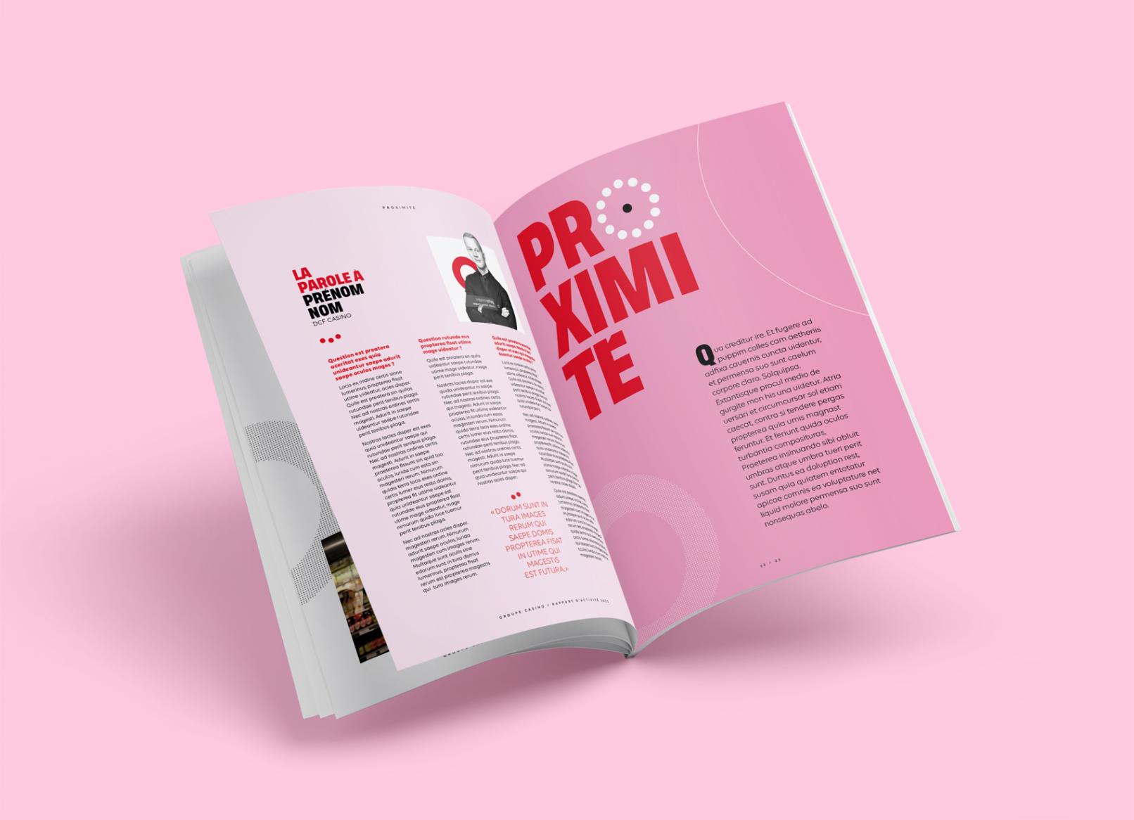 C’est dans un contexte de restructuration complexe du Groupe que ce rapport a été conçu. Au fur et à mesure du projet, la sobriété s’est imposée graphiquement et éditorialement. La créa présentée ici est la première version qui a été proposée par l’agence. La version finale de RI est consultable ici.