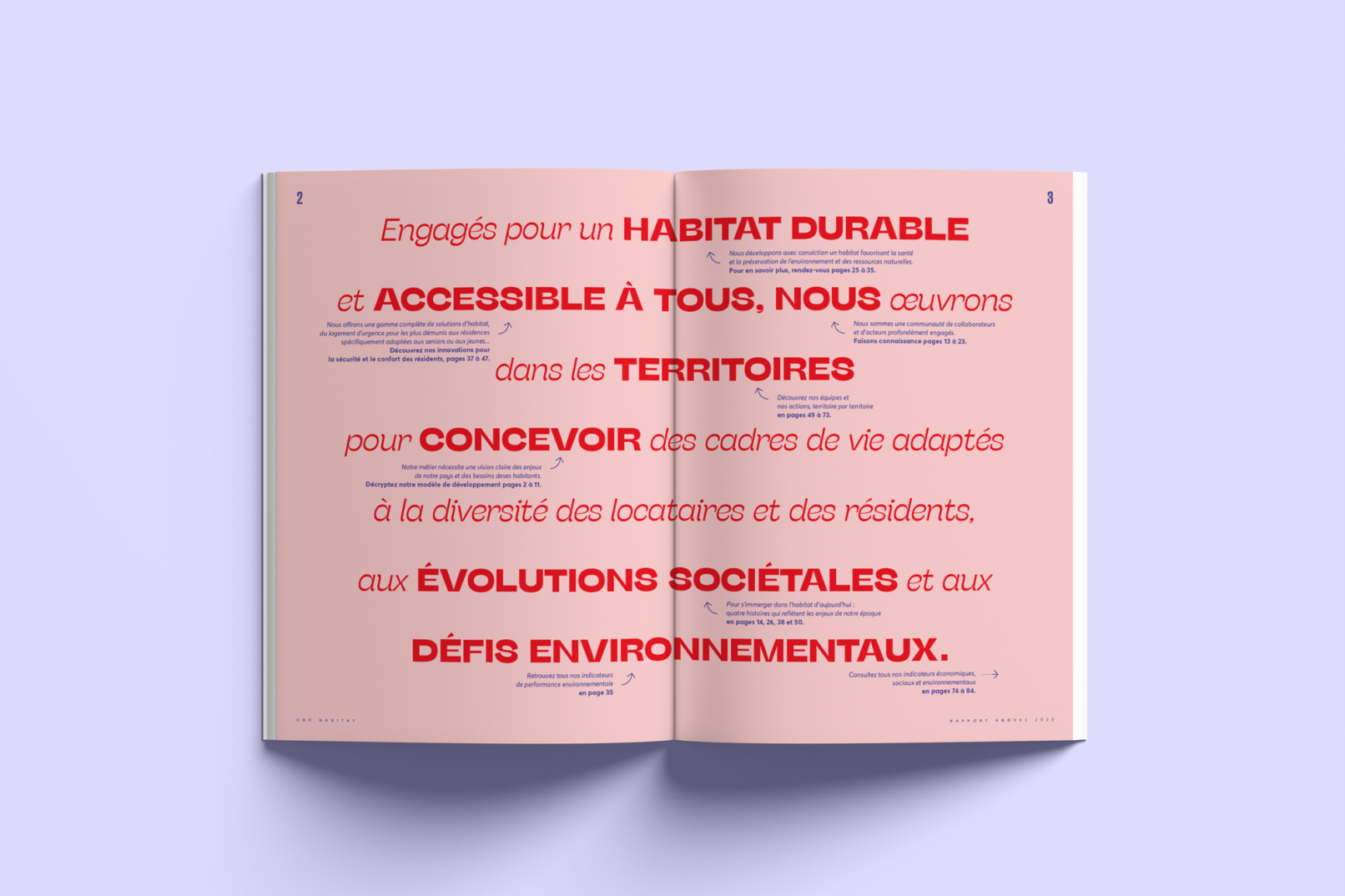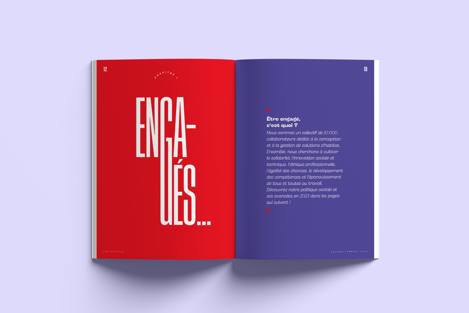 Opérateur global de l’habitat d’intérêt public, CDC Habitat est l’un des acteurs majeurs de l’habitat en France. Pour son rapport 2023, le groupe souhaitait valoriser sa stratégie, ses engagements et l’impact de ses actions dans les territoires. Les faits et les chiffres étant à l’honneur dans ce document, une composition essentiellement typographique a permis de valoriser le sens des mots. Ce projet a été réalisé dans le cadre d’un appel d’offre.