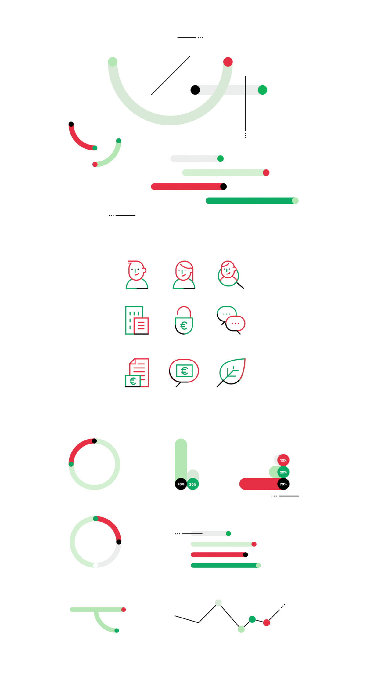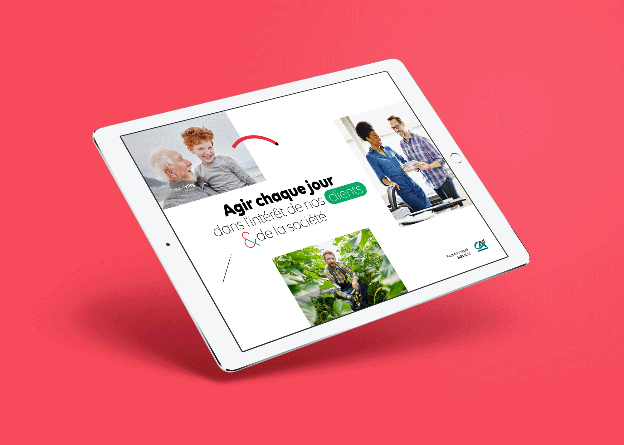 Pour répondre à cet appel d’offre, nous avons fait le choix d’un graphisme connecté à l’identité du groupe Crédit Agricole tout en l’enrichissant. La création d’un « alphabet » déclinable en pictogrammes, graphes et systèmes de navigation, à la fois rond et coloré, permet d’animer les différents contenus de ce support digital.