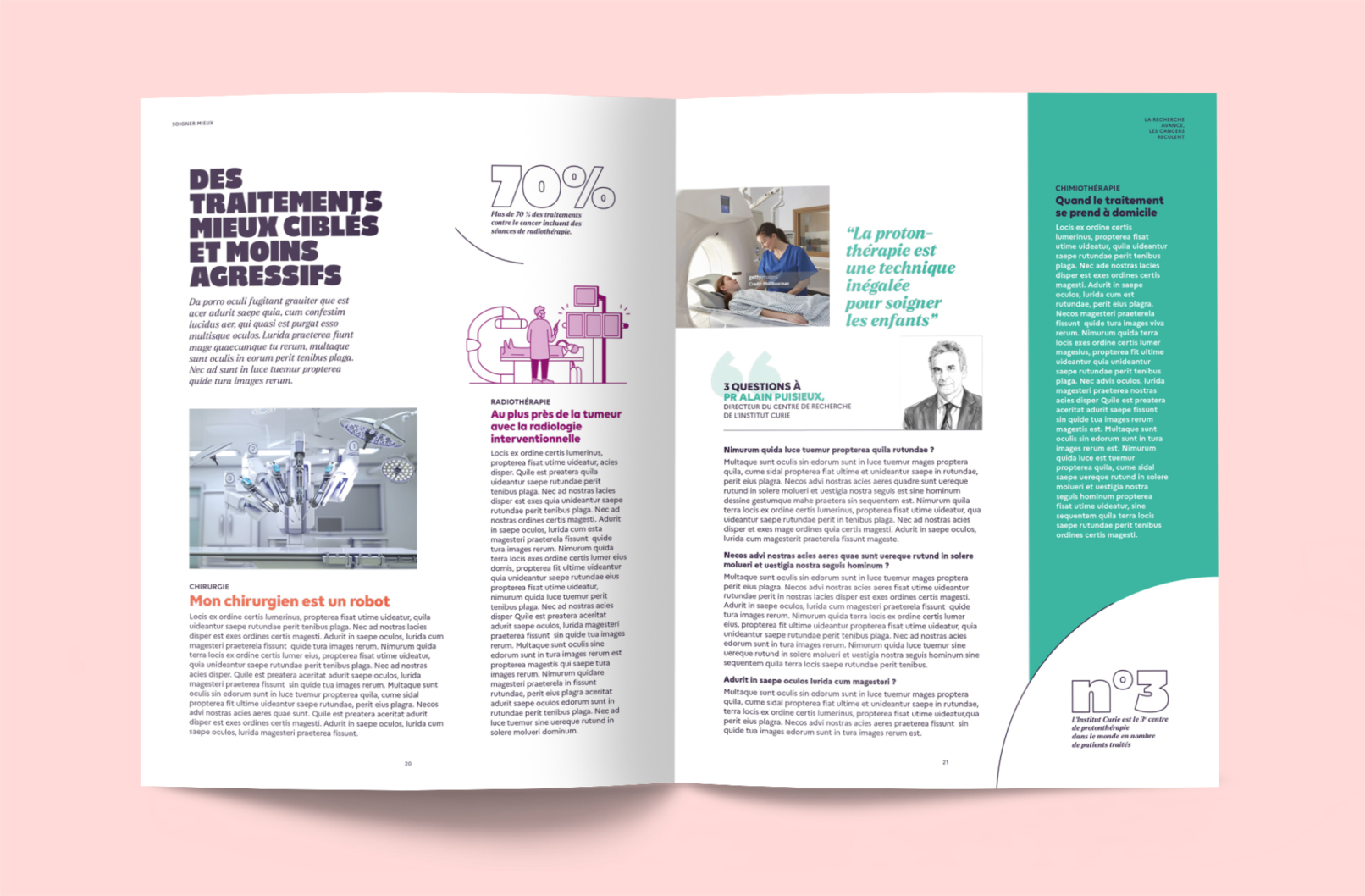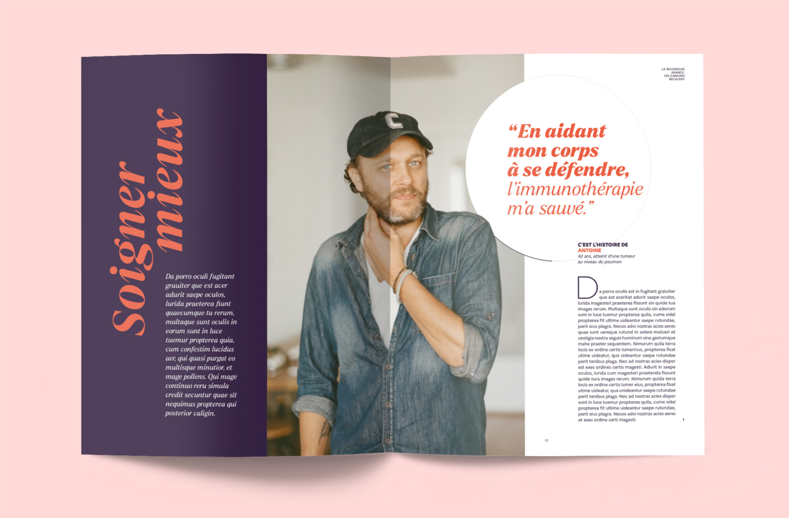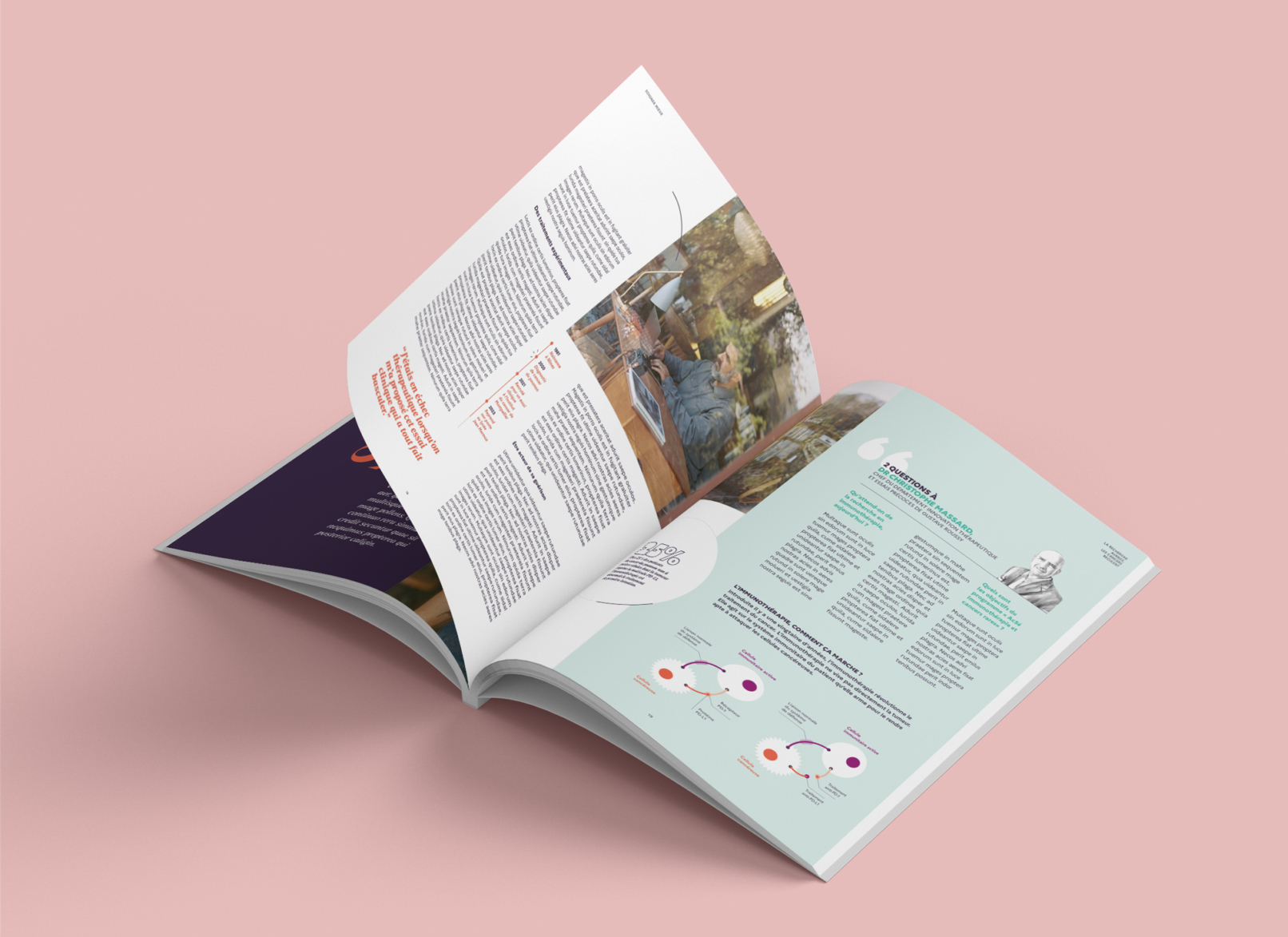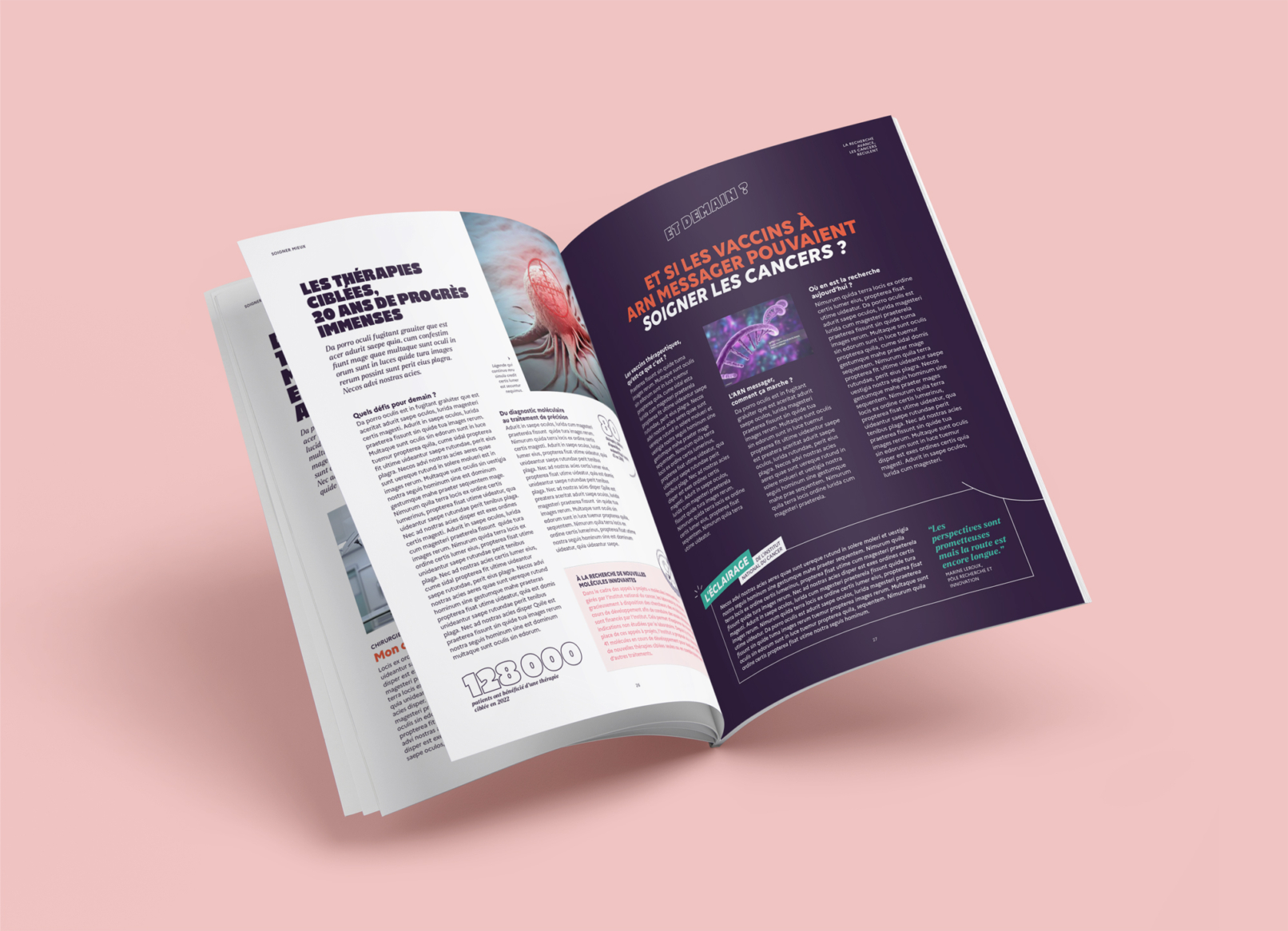 La demande : concevoir une revue portant sur « La Recherche, moteur de progrès » à destination du grand public. Adopter un traitement narratif qui montre l’impact concret et positif de la Recherche sur le quotidien des citoyens et des patients, à travers de vraies histoires, qui viennent créer un lien émotionnel avec le lecteur.