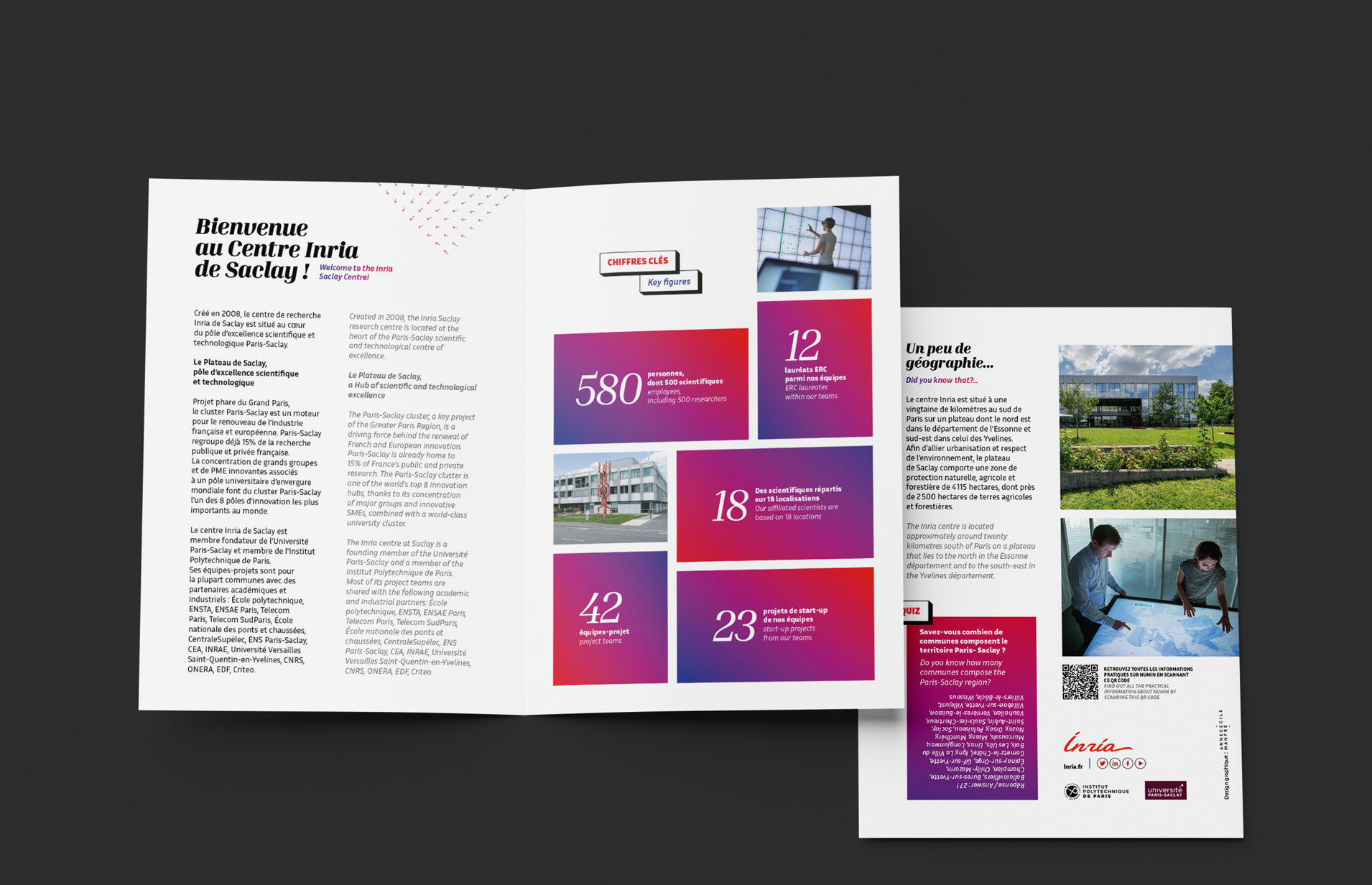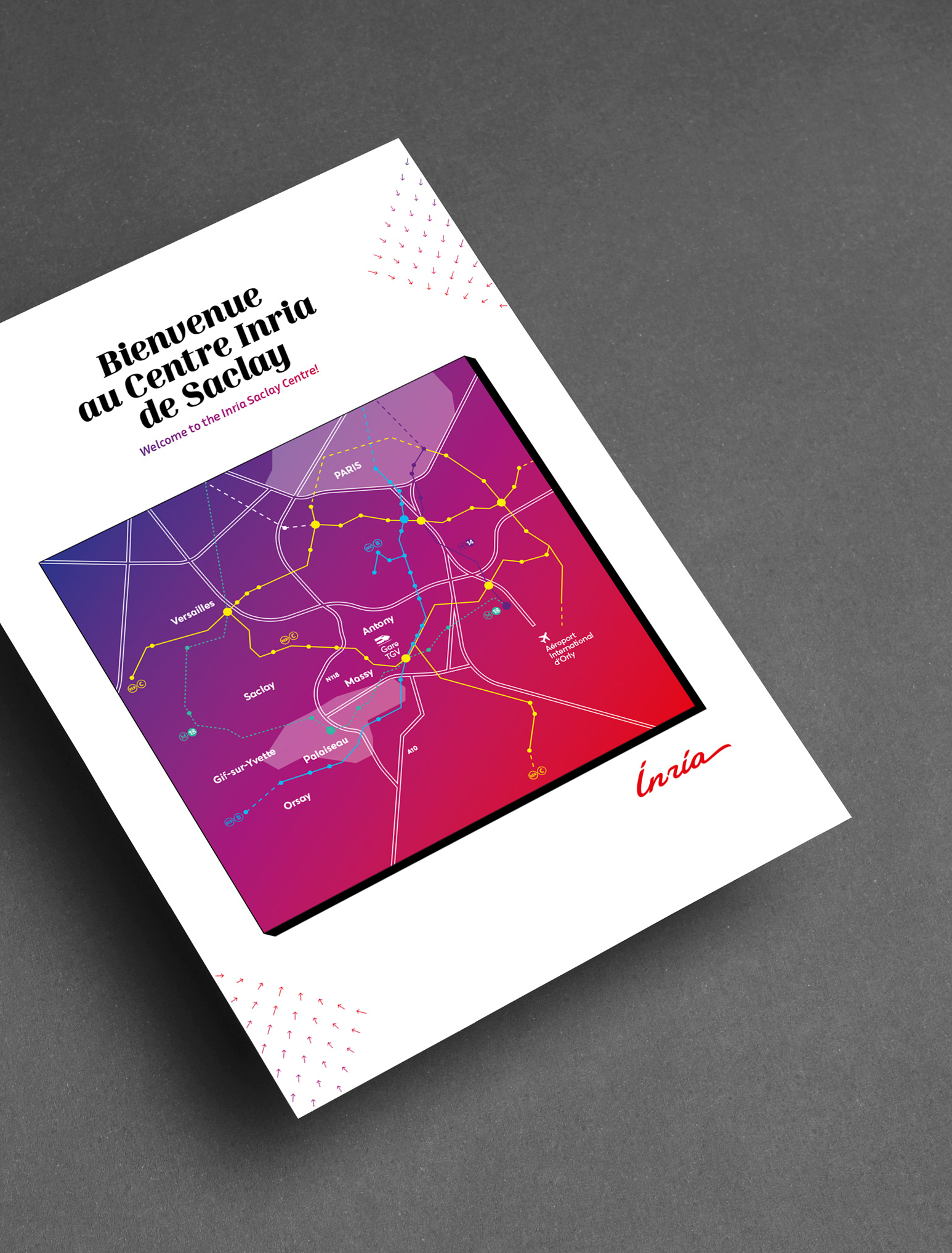 J’ai accompagné le centre de recherche Inria de Saclay dans la conception d’un livret d’accueil intégrant une carte graphique sur mesure, conçue comme un outil de repérage et de mobilité pour les équipes de recherche.