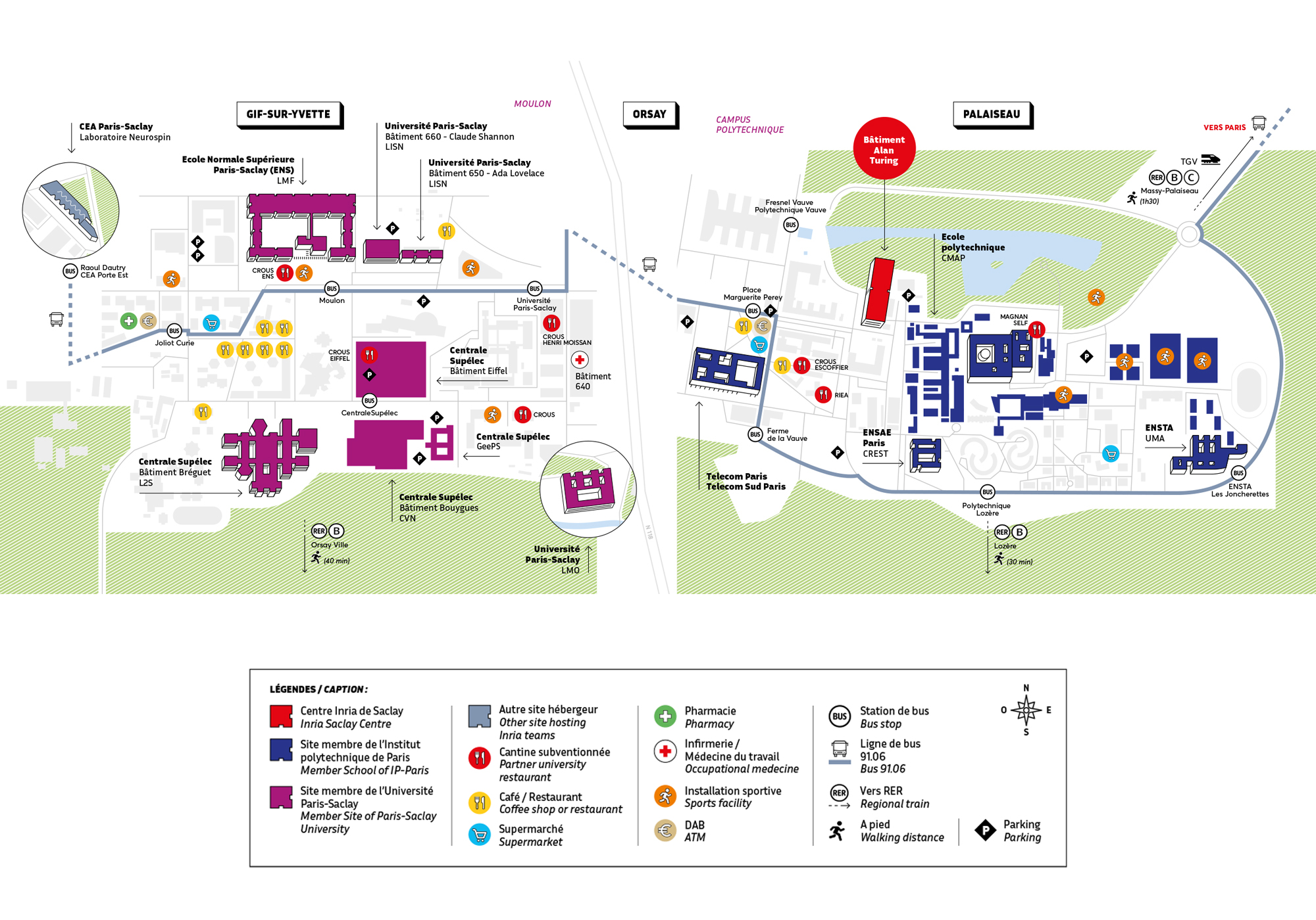 La problématique : réparti entre le bâtiment Turing et plusieurs sites partenaires sur le plateau de Saclay et au-delà, le centre évolue dans un environnement multi-site. Ce contexte a nécessité la création d’un support capable de clarifier les implantations et de faciliter l’orientation et les déplacements des chercheurs.