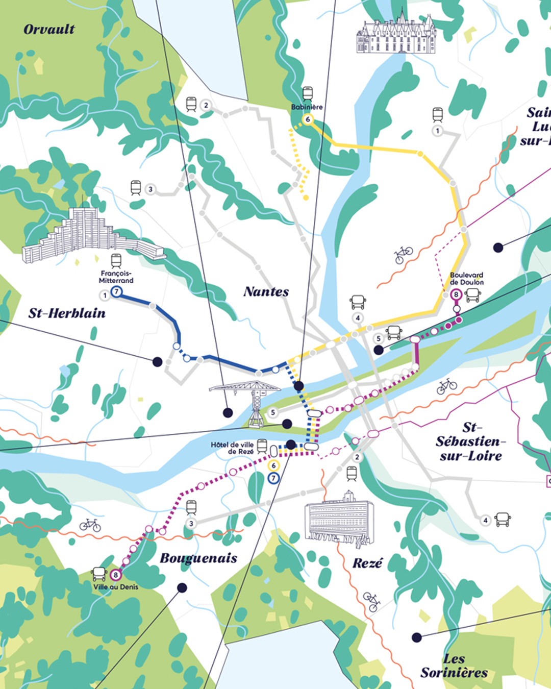 Missionnée par la rédaction du magazine de Nantes Métropole, j’ai conçu le graphisme et les illustrations de ce journal hors-série inédit, mettant en lumière 12 projets majeurs illustrant la transformation du territoire. L’enjeu principal était de rendre ces projets accessibles au grand public, avec un ton éditorial et graphique pédagogique, clair et engageant.
