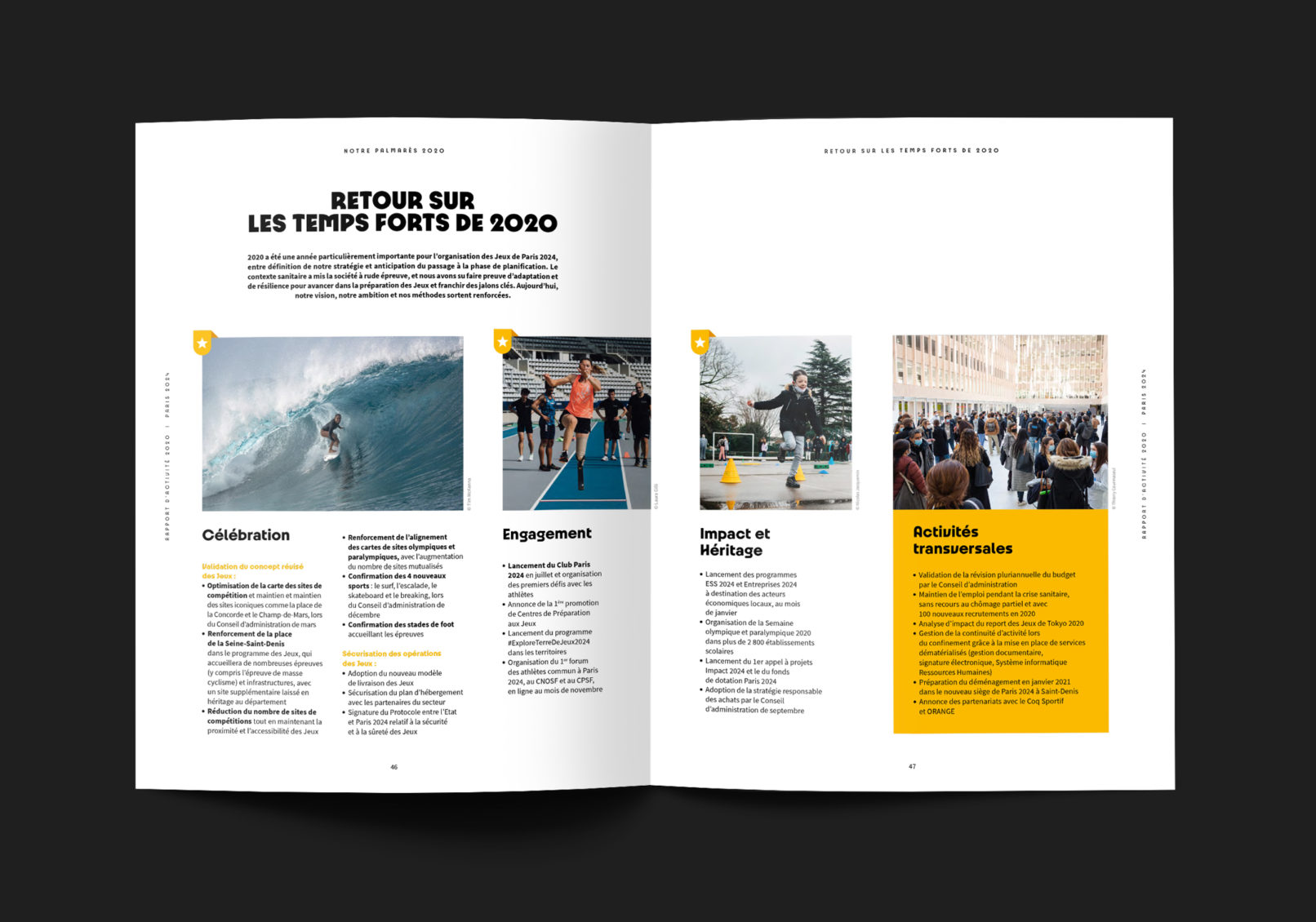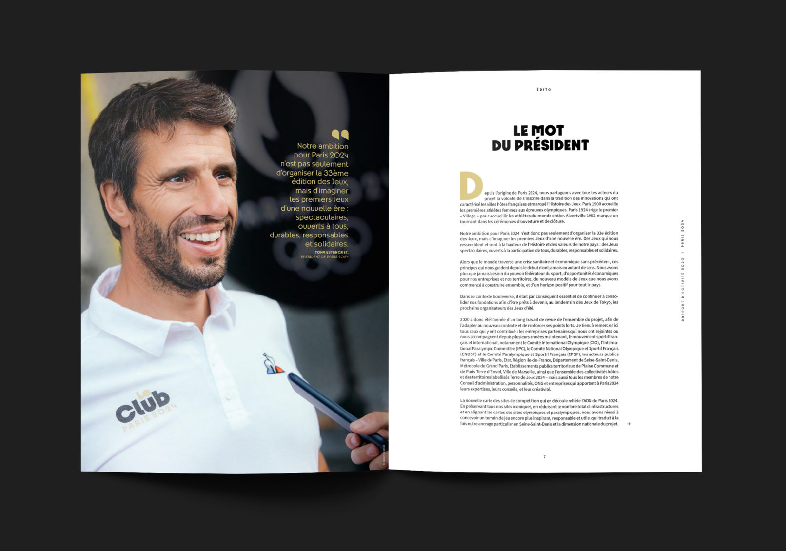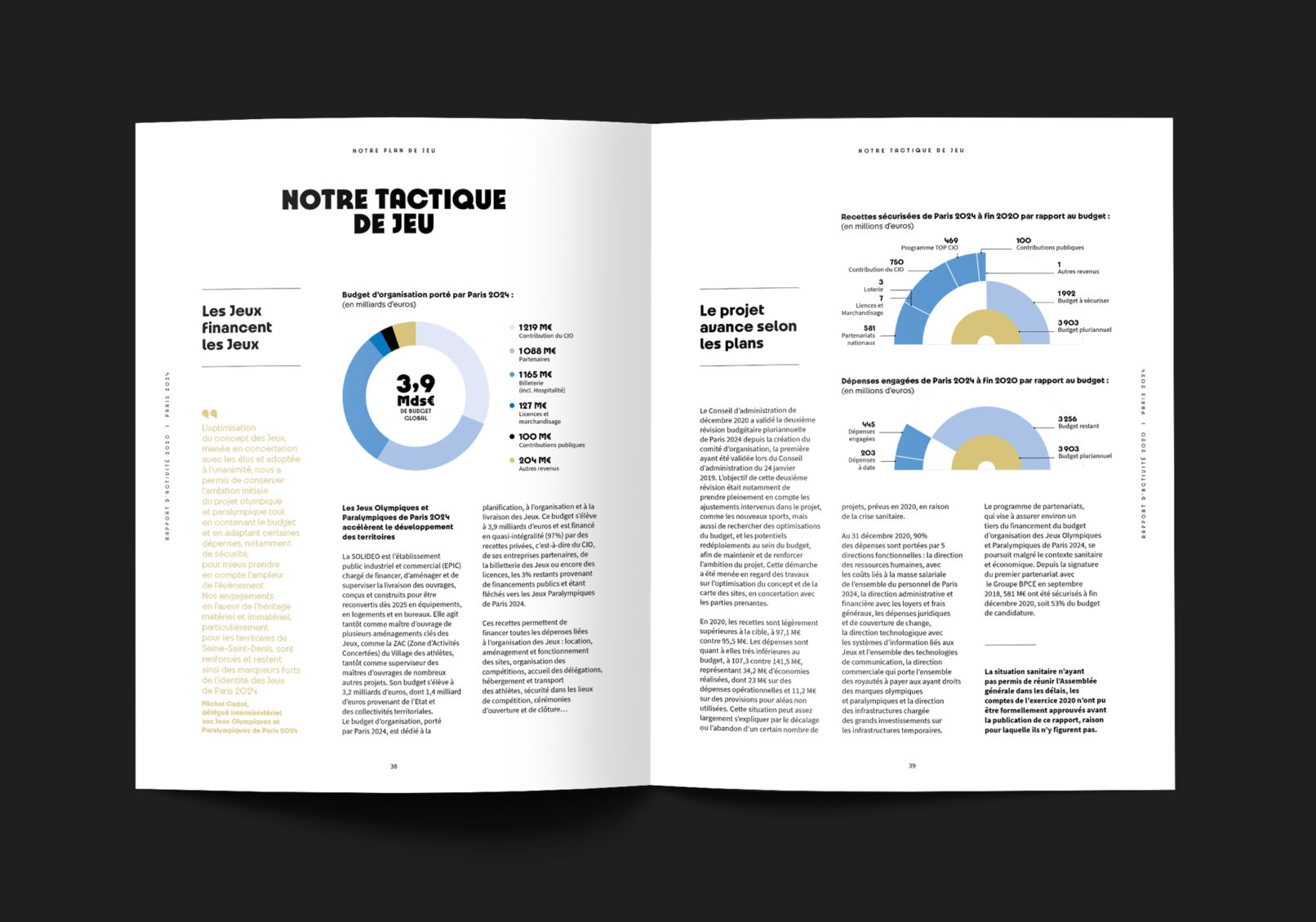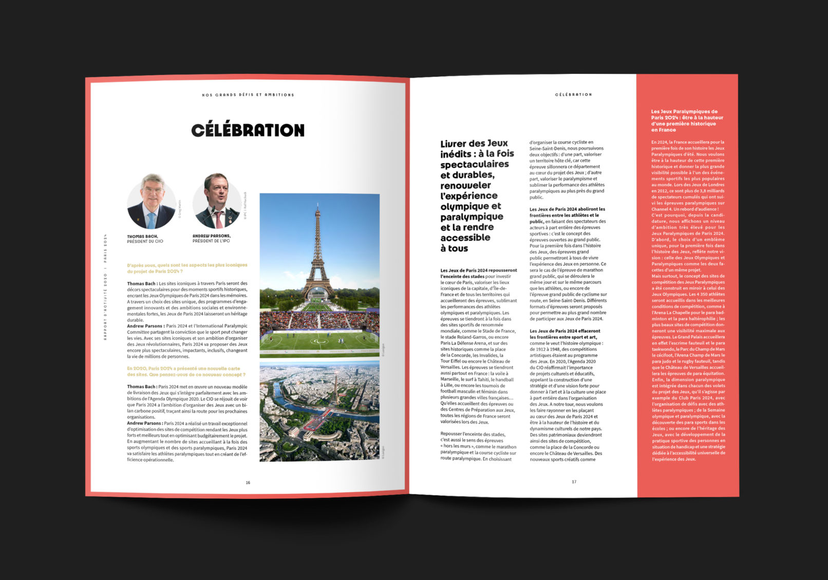 L’équipe de communication de Paris 2024, sous la direction de Joachim Roncin, m’a confiée la création du tout premier rapport annuel des JO. Le Comité d’organisation des Jeux olympiques et paralympiques (COJO) y synthétise les actions déjà réalisées à ce jour. Une belle aventure graphique et humaine dans les coulisses de ce grand événement !