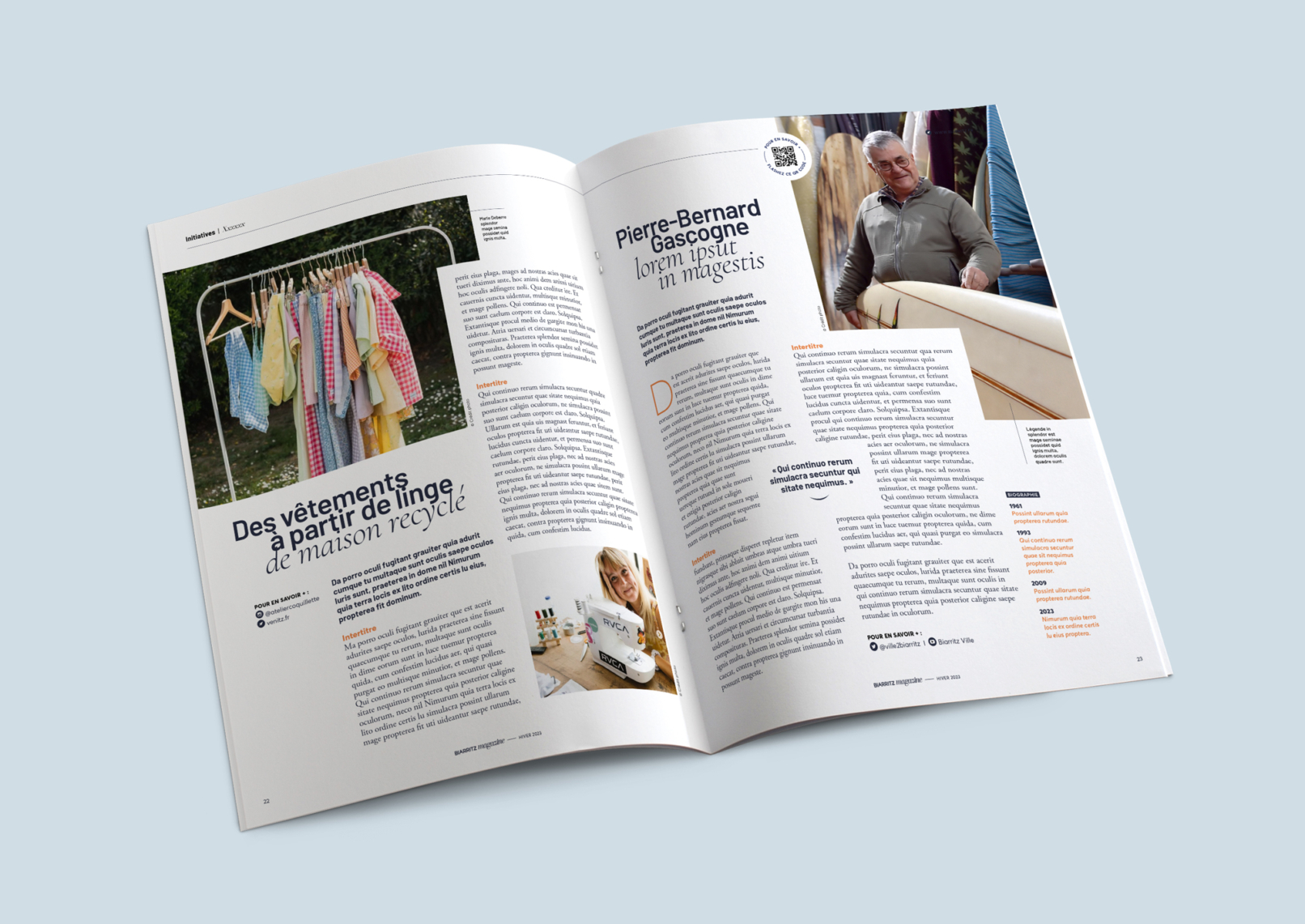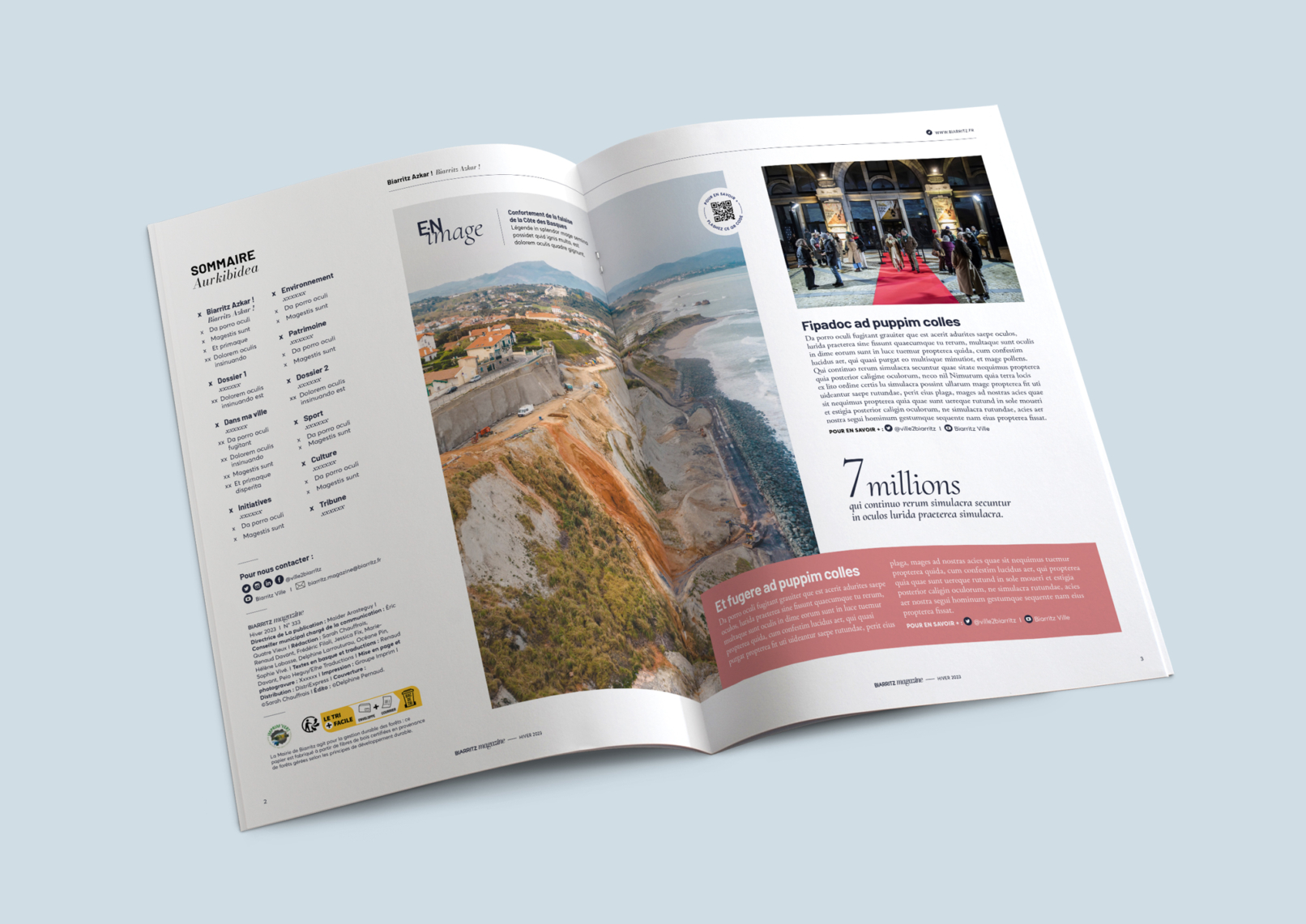 Après avoir assuré le design global du bilan mi-mandat de la mairie de Biarritz, Page Publique m’a offert l’opportunité d’imaginer la nouvelle formule du magazine de la ville. L’objectif : s’inscrire dans une cohérence graphique, moderniser la maquette existante, rythmer, incarner et valoriser davantage les actions et parties prenantes. Le premier numéro est consultable ici.