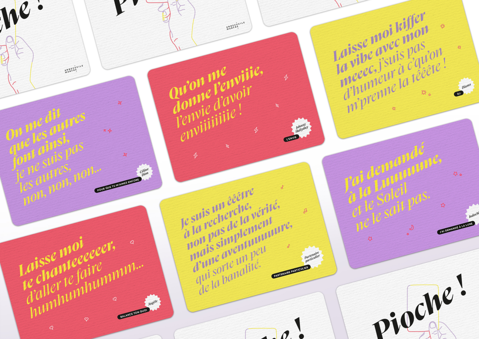 Cette année, plus que des vœux, j’ai eu envie d’envoyer un jeu à mes collaborateurs. Un jeu de 6 cartons qui leur permettraient de dire « non » en chanson, sans pression, et qu’ils ou elles pourraient distribuer quand ça leur chante. J’espère qu’ils en feront bon usage !